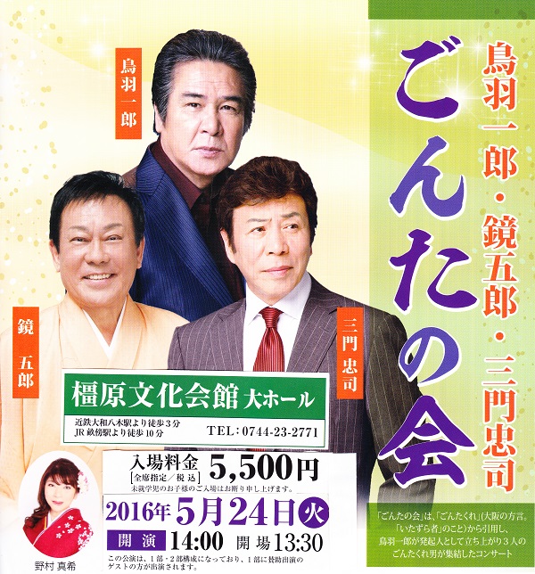 2016.05.01 鳥羽一郎・鏡五郎・三門忠司『ごんたの会』出演 01.野村真希 2016年5月24日(火) 開演:14時橿原文化会館大ホール 今年も鳥羽さんからのお声かけで、野村真希も「ごんたの会」に出演させていただきます。皆さんお越しいただけたら嬉しいです。 新曲レコーディング『ブギウギ!それゆけエンジェル』『愛をありがとう』 前の記事 「桜井ええとこや」ビデオ完成披露宴会 次の記事