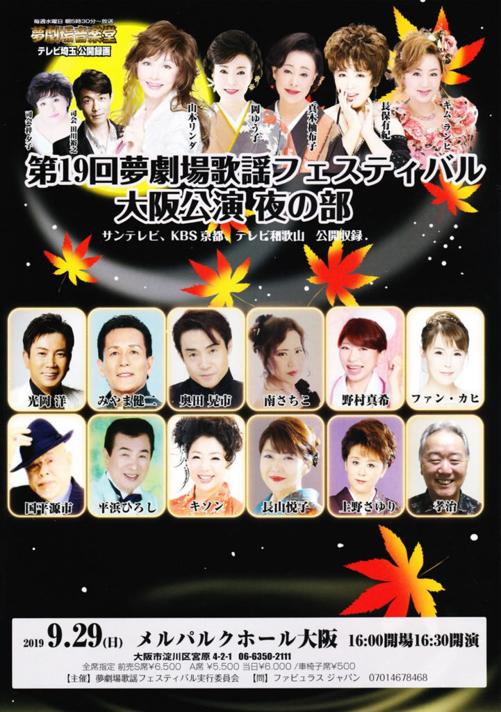 2019.08.26 第19回夢劇場歌謡フェスティバル 大阪公演 夜の部 01.野村真希 山本リンダさん、長保有紀さん、岡ゆう子さん、真木柚布子さんなど、豪華出演陣!! 野村真希も参加させていただきます。みなさまと楽しいひと時を♪♪ 日時2019年9月29日(日)16:00 開場16:30 開演会場メルパルクホール大阪 野村真希「大阪エエトコヤ」~2025大阪万博 盛功 応援ソング~ 前の記事 演歌JACKS(エンカジャックス)クリスマスディナーショー 次の記事